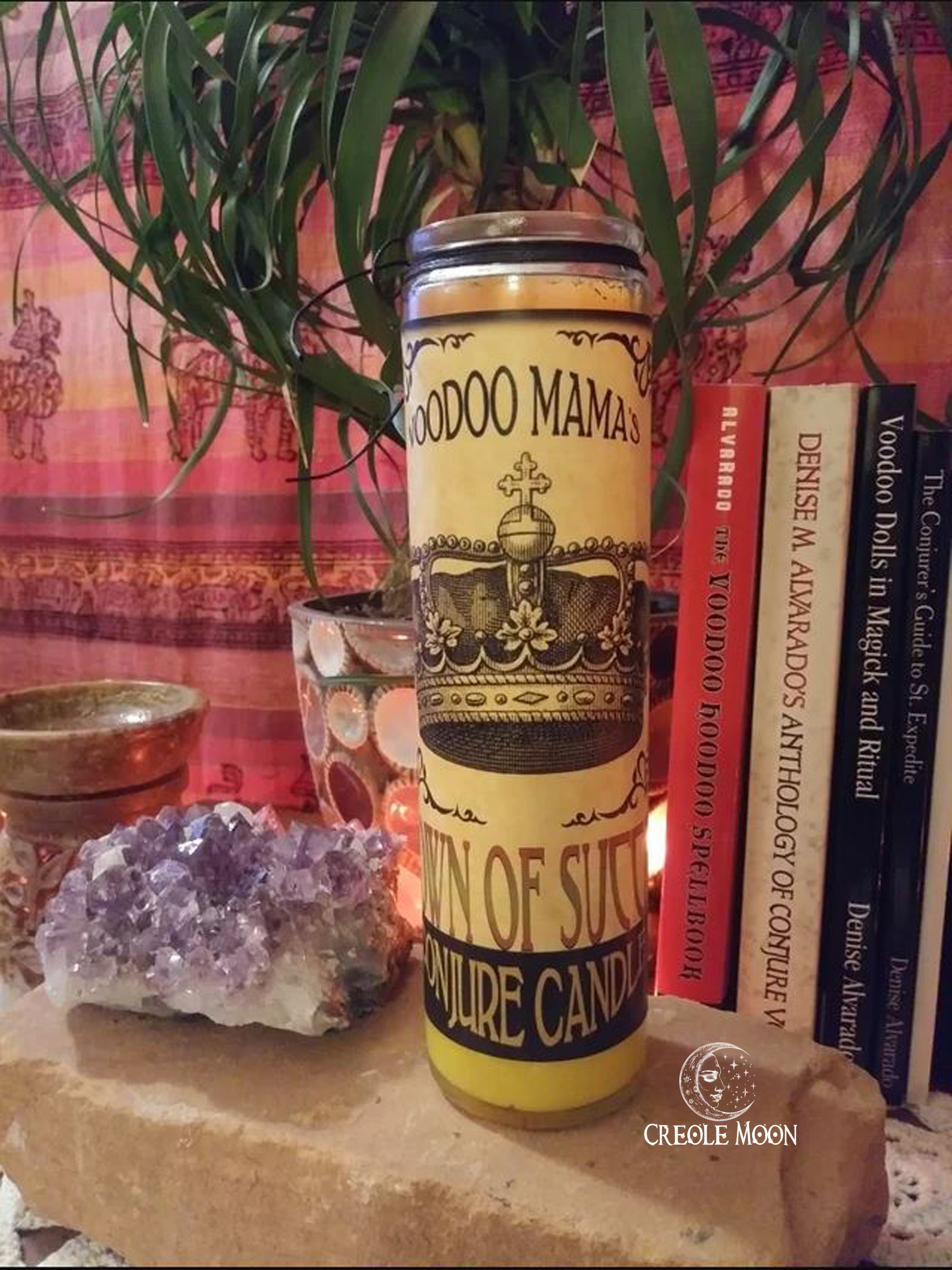 To work the spell: touch the candle to your head and speak, “May all my works be crowned with success.” Write your petition, place it beneath the candle, and light it. Let your words rise with the flame, and recite the Psalm 118 excerpt on the label—bridging the worlds, inviting blessing. Each candle burns for approximately 120 hours, and when the wax is spent, the vessel transforms: a vase for altar flowers, a container